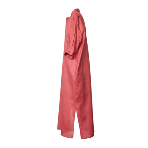 Inspired by the chilled vibe of bohemian lifestyles this kaftan is made from pure linen to an elegant and relaxed silhouette . Defined by a mandarin collar the kaftan falls to an ankle length with side hem slits . The front placket has concealed self covered press stud buttons while a back yoke and centre pleat offers a fluid drape .Elbow length sleeves have a flat cuff with covered buttons.