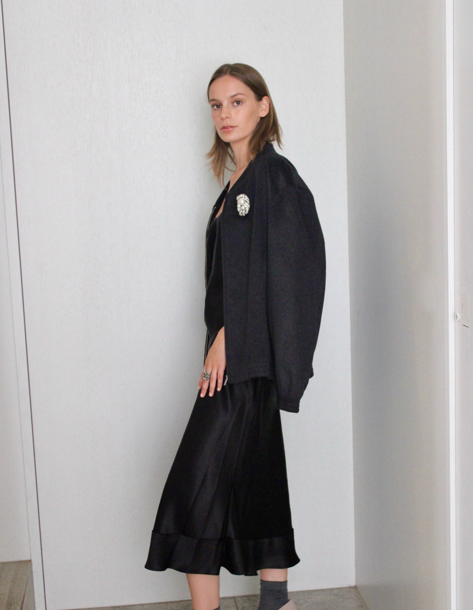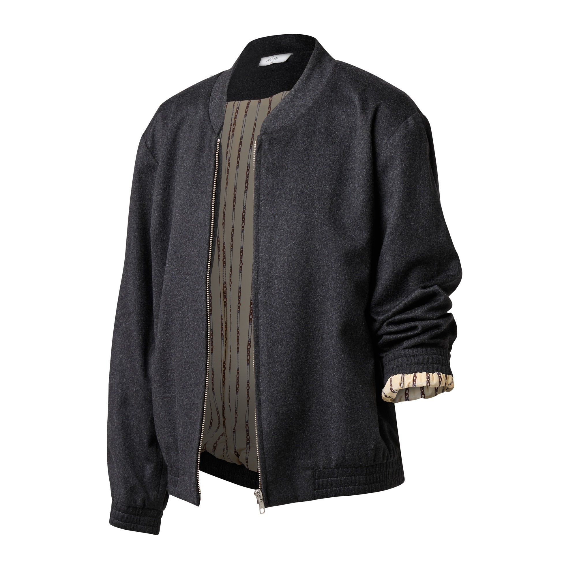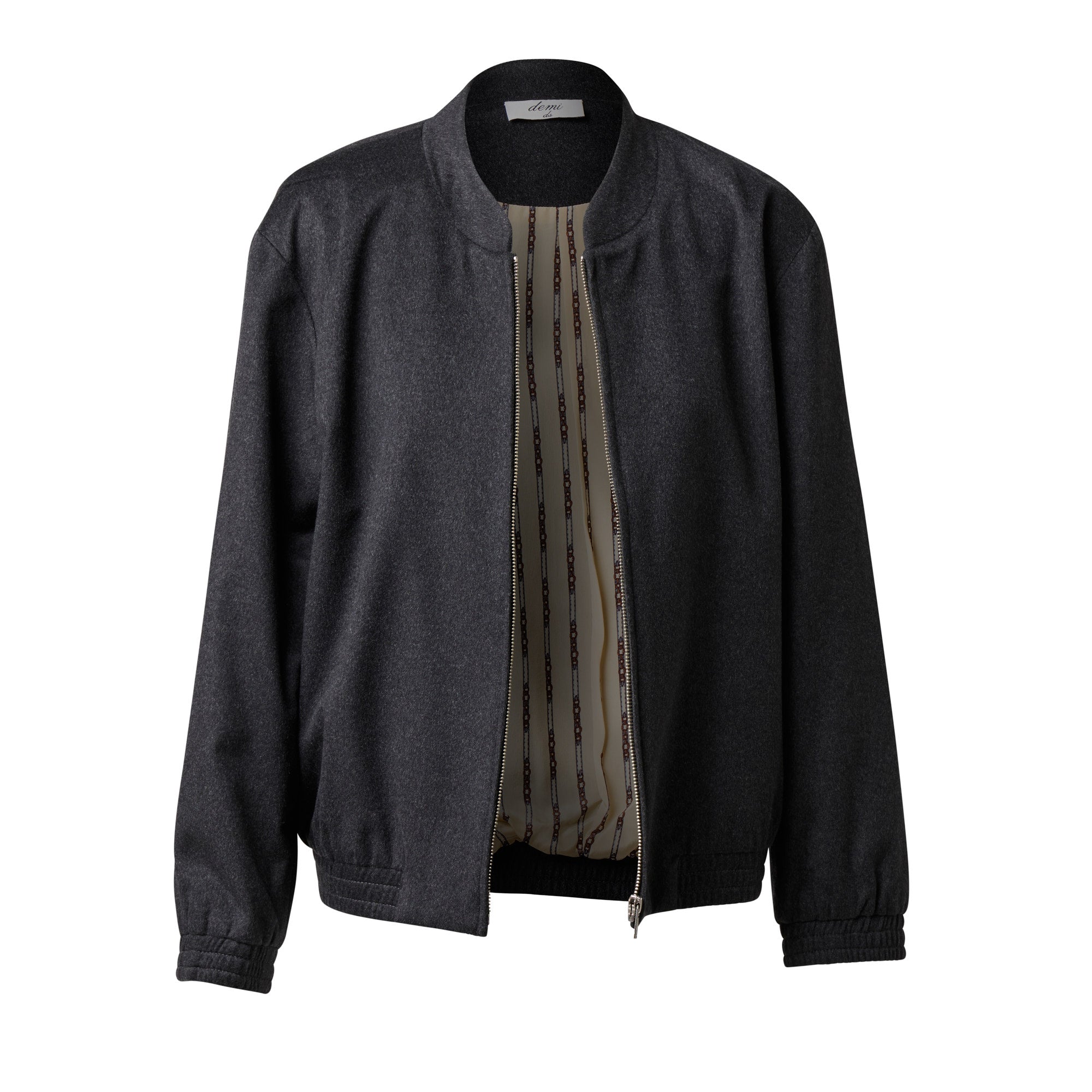 Embodying casual luxe, our boxy-shaped bomber jacket is made from a quality Italian fabric and features a silver centre zip opening. With a gathered cuff and blouson waist, the bomber offers a style mix between dress and casual. Inside is an equestrian themed printed crepe de chine lining for a touch of whimsy.